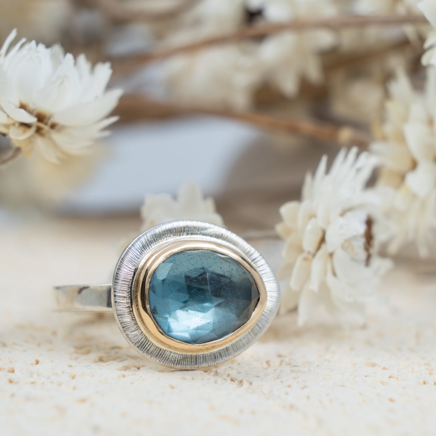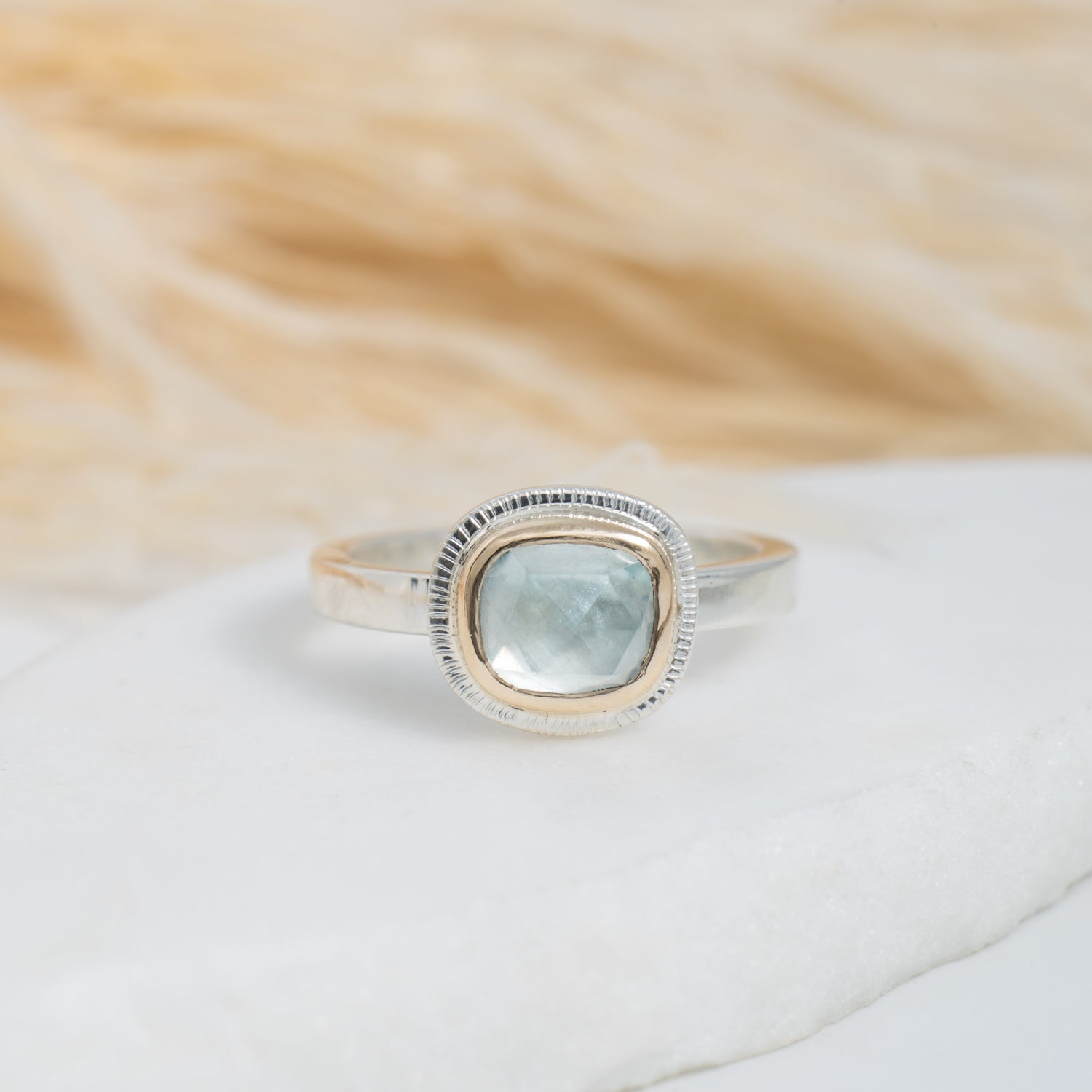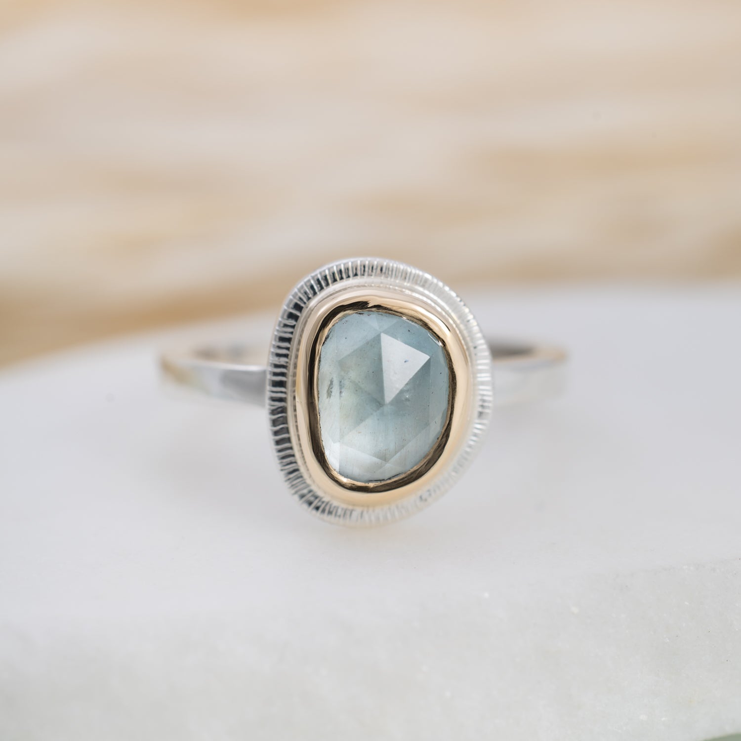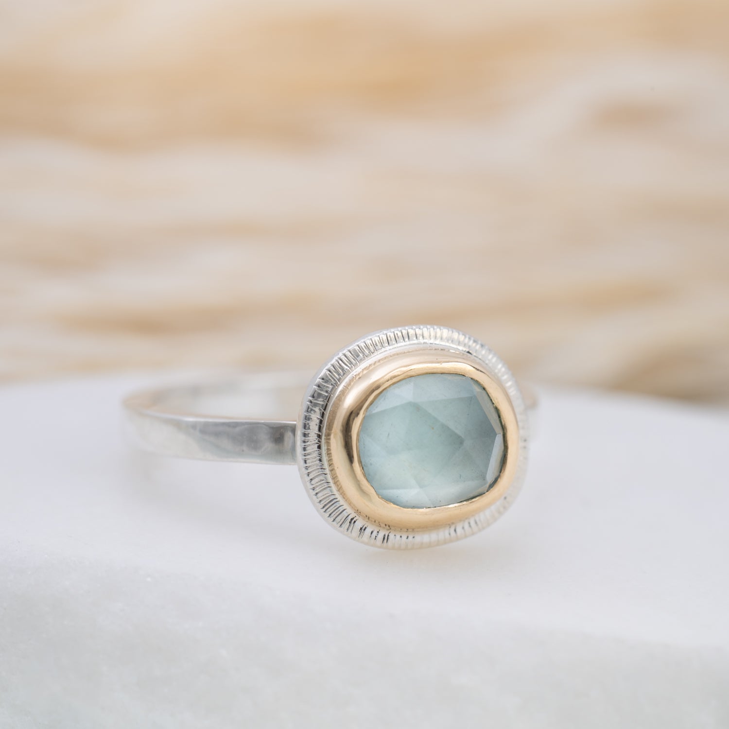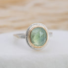 Our mixed metal Halo Rings feature hand-selected gemstones surrounded by a halo of 14k gold, set on a sterling silver band. The mix of metals highlights the natural beauty of each stone, creating a piece that’s compelling yet timeless.