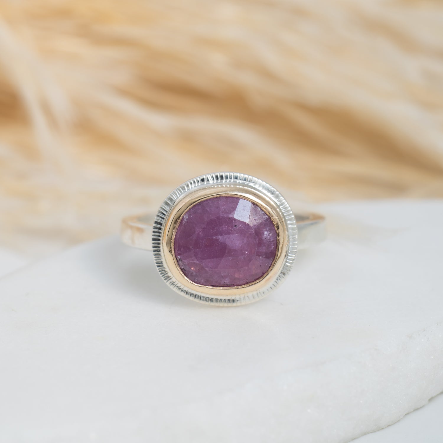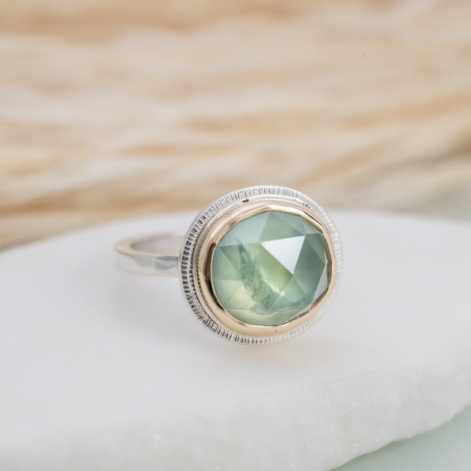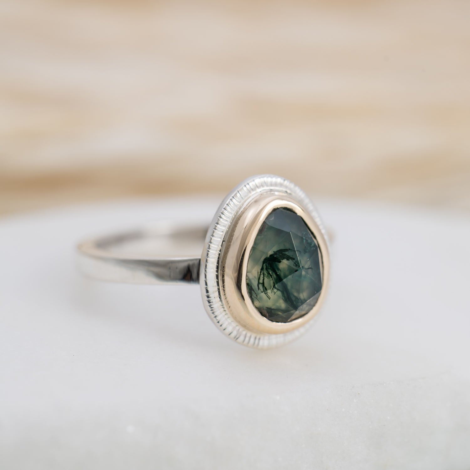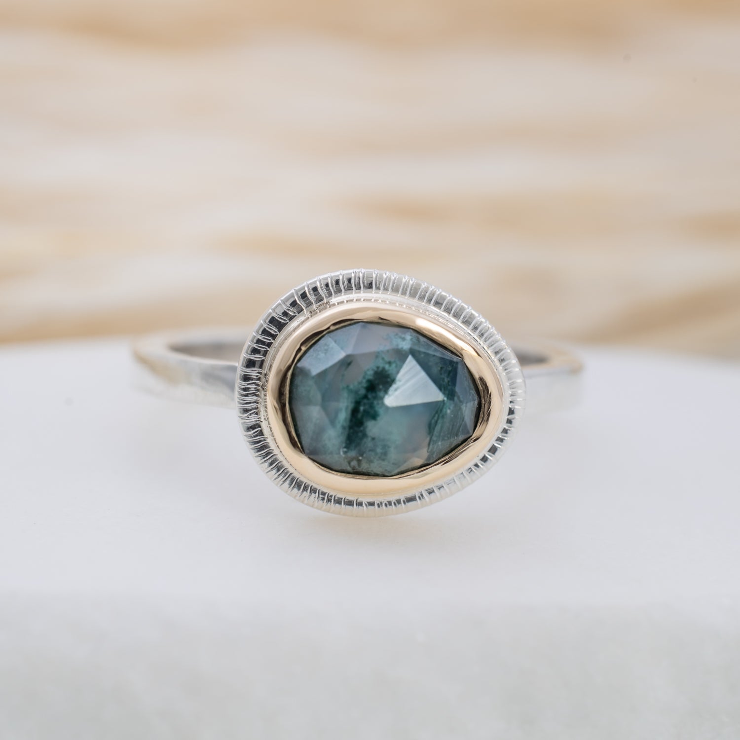 Our mixed metal Halo Rings feature hand-selected gemstones surrounded by a halo of 14k gold, set on a sterling silver band. The mix of metals highlights the natural beauty of each stone, creating a piece that’s compelling yet timeless.